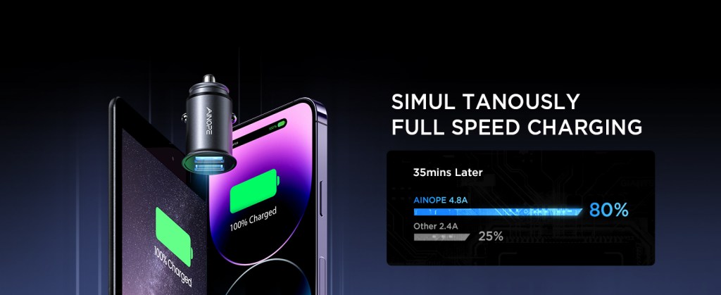 - 4.8A/24W EFFICIENT CHARGE: AINOPE car charger can reach maximum output of 2.4A/12W per port, which the charging speed is 2X faster than 1A/5W. With 4.8A total power, this dual USB cigarette lighter adapter enables you to charge two devices simultaneously at full speed with 2.4A per USB port. Please note: it does not support Qualcomm Quick Charge. The charging page WILL NOT show fast charge when charging.