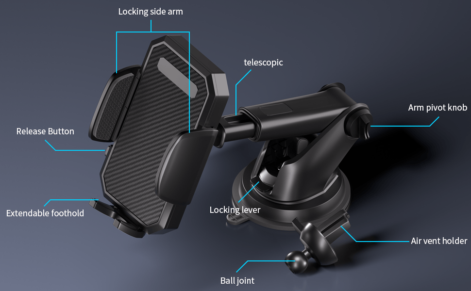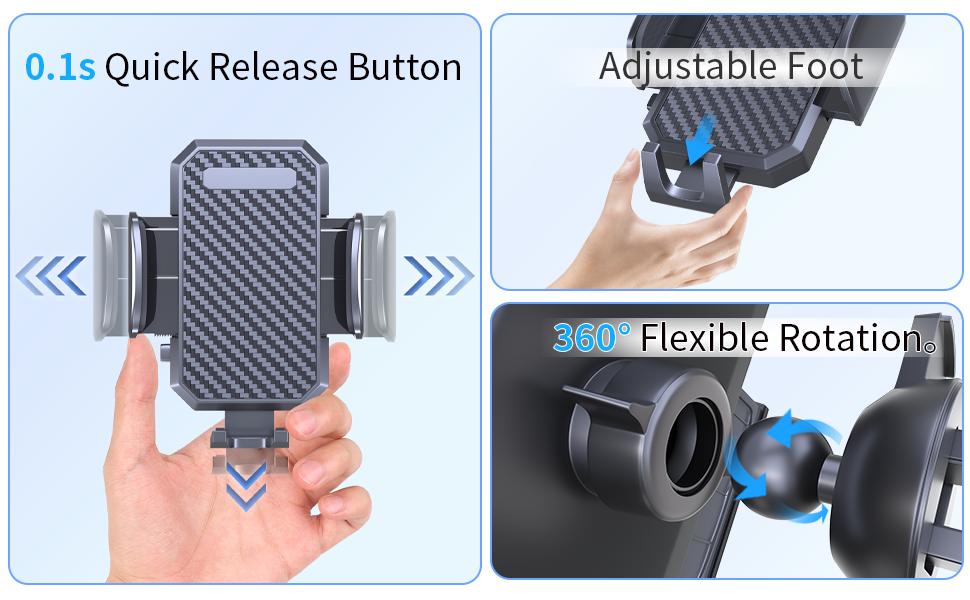Quick Release/Lock:Just press the release button on the left, clamp arms will smoothly slide to release your phone.Just press the lock bar,your phone will hold on stably.